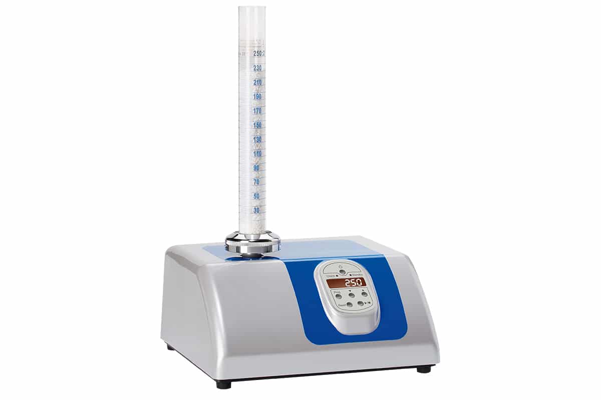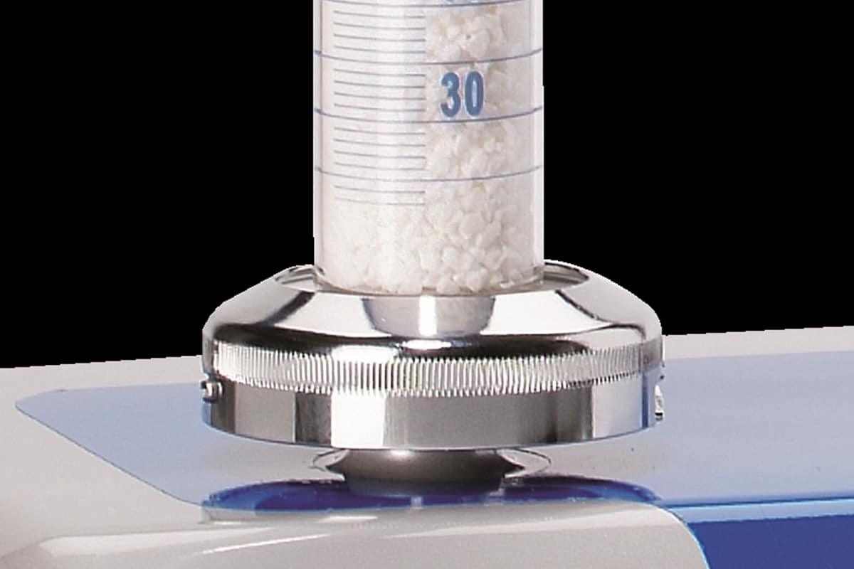 L’instrument permet de déterminer la densité des poudres tassées. Il est composé d’un boîtier en plastique souple, équipé d’un moteur, d’une commande pour le mécanisme de bourrage et d’un verrou de tension pour maintenir le cylindre de mesure. Le JEL STAV II se commande via un écran. Les éprouvettes graduées sont disponibles en différentes tailles : de 10, 25, 50, 100, 250, 500 et 1000mL. Un capot d’insonorisation est disponible si nécessaire.